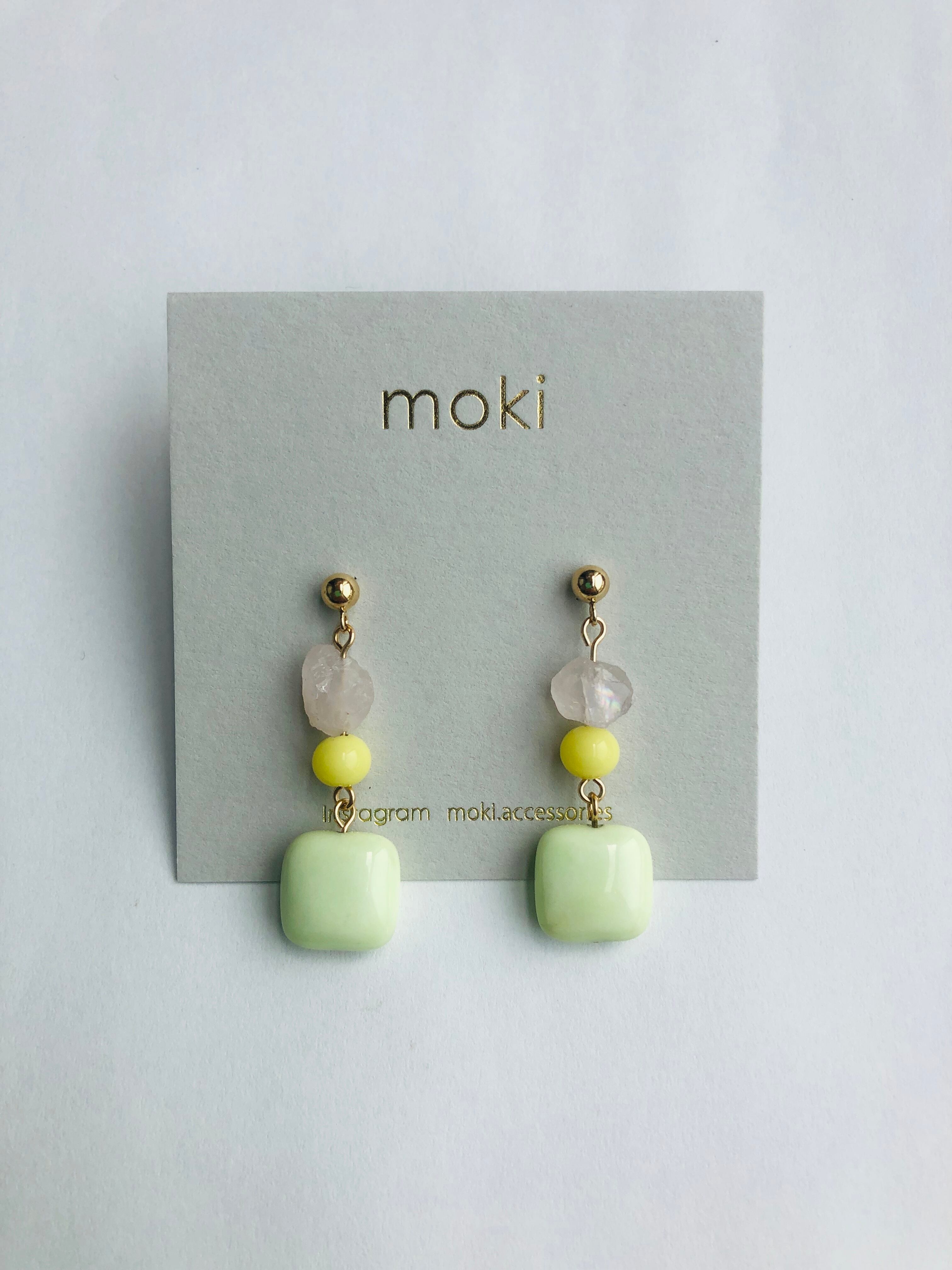 ローズクォーツ、ジャパンヴィンテージビーズ、レモンクリソプレーズのピアスです。