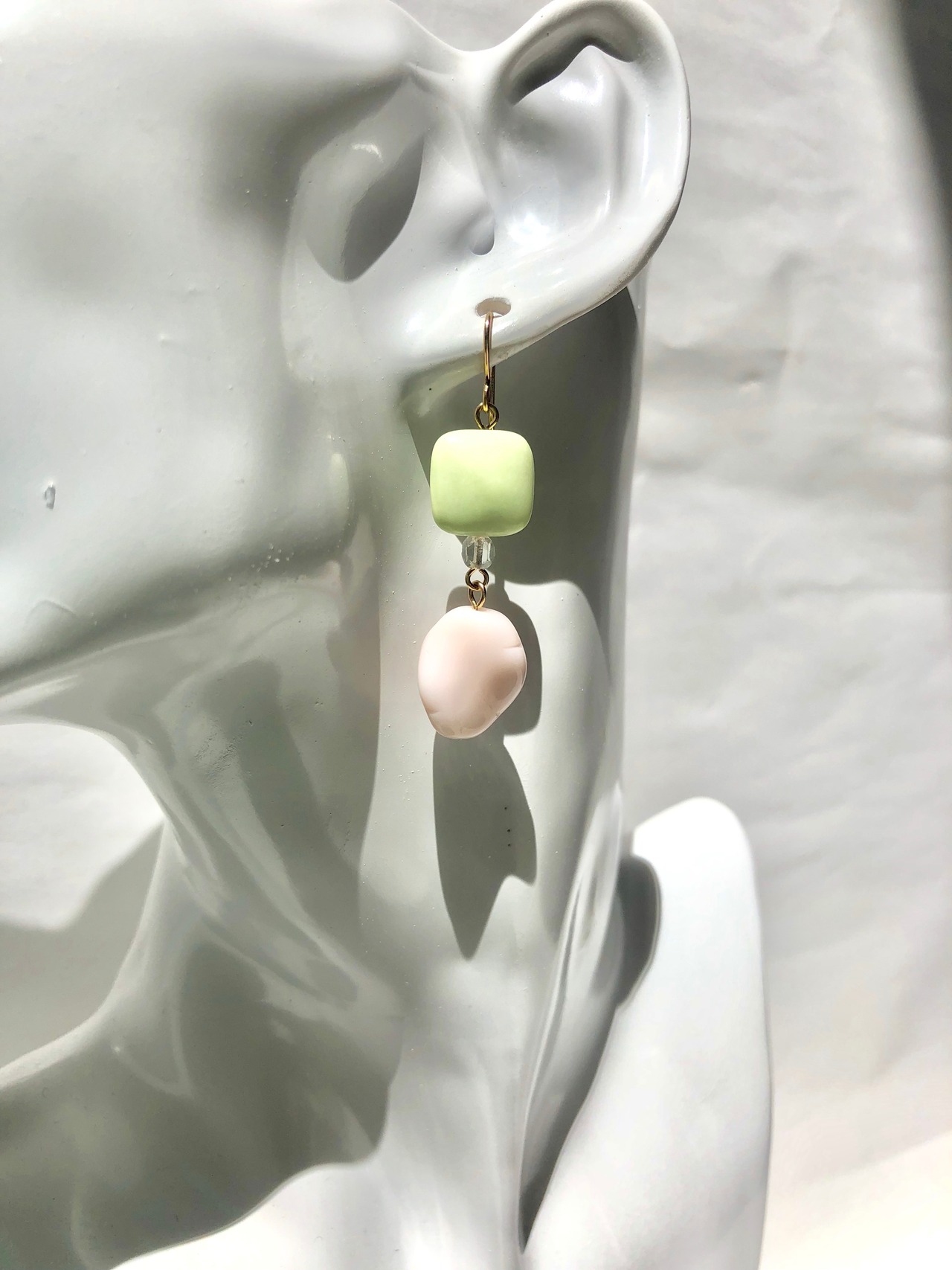 レモンクリソプレーズ、チェコクリアヴィンテージビーズ、西ドイツピンクヴィンテージグラスビーズのピアスです。 (素材) 14kgf (重さ) 7g