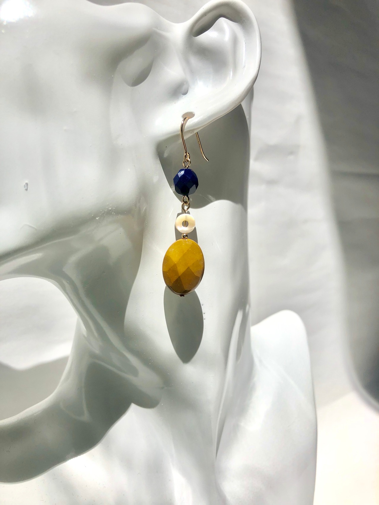 チェコブルーヴィンテージビーズ、マザーオブパール、14kgfビーズ、ムーアカイトのピアスです。 (素材) 14kgf (重さ) 6g